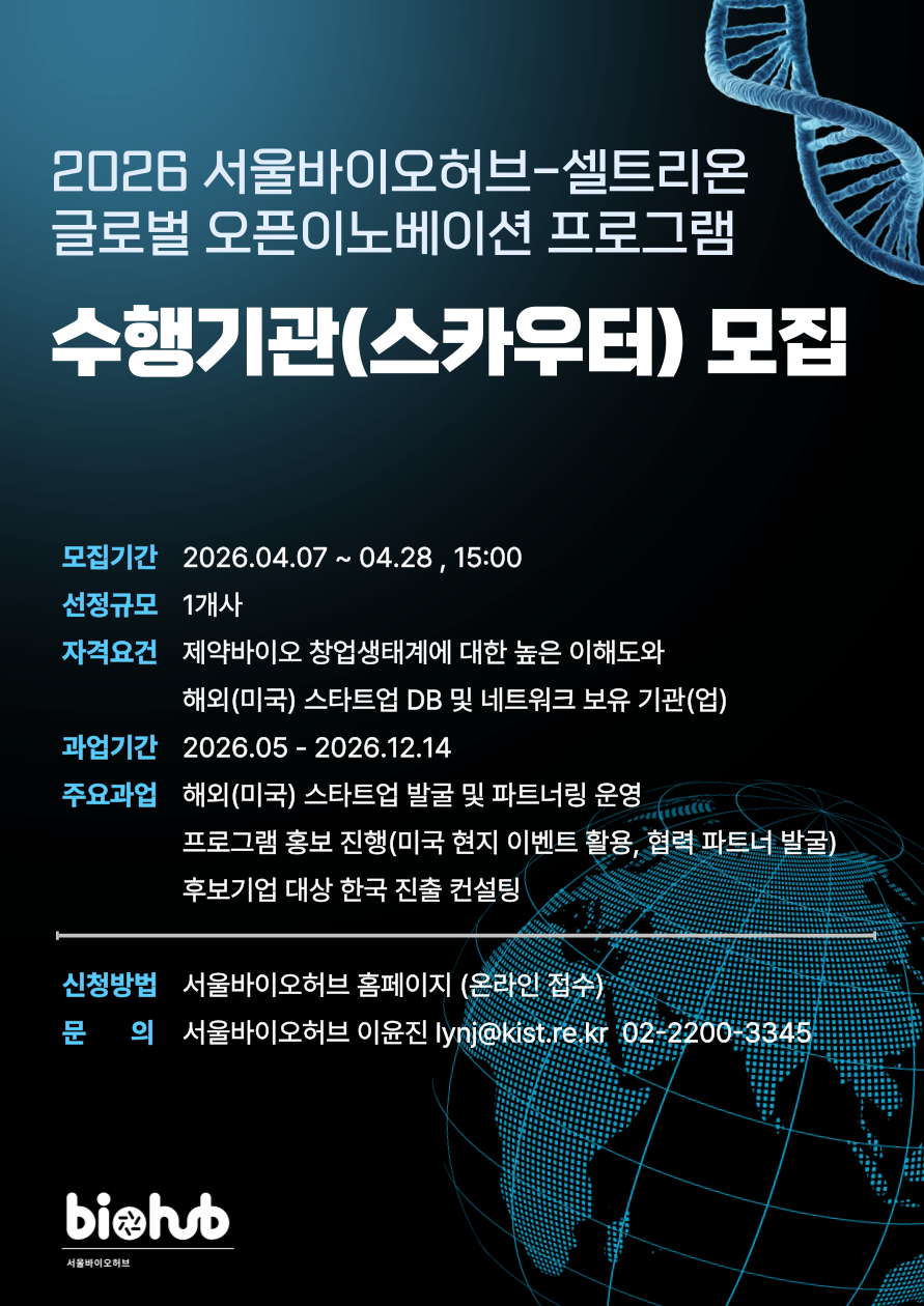 [수행기관 모집] 2026 서울바이오허브- 셀트리온 글로벌 오픈이노베이션 프로그램 수행기관(스카우터) 모집