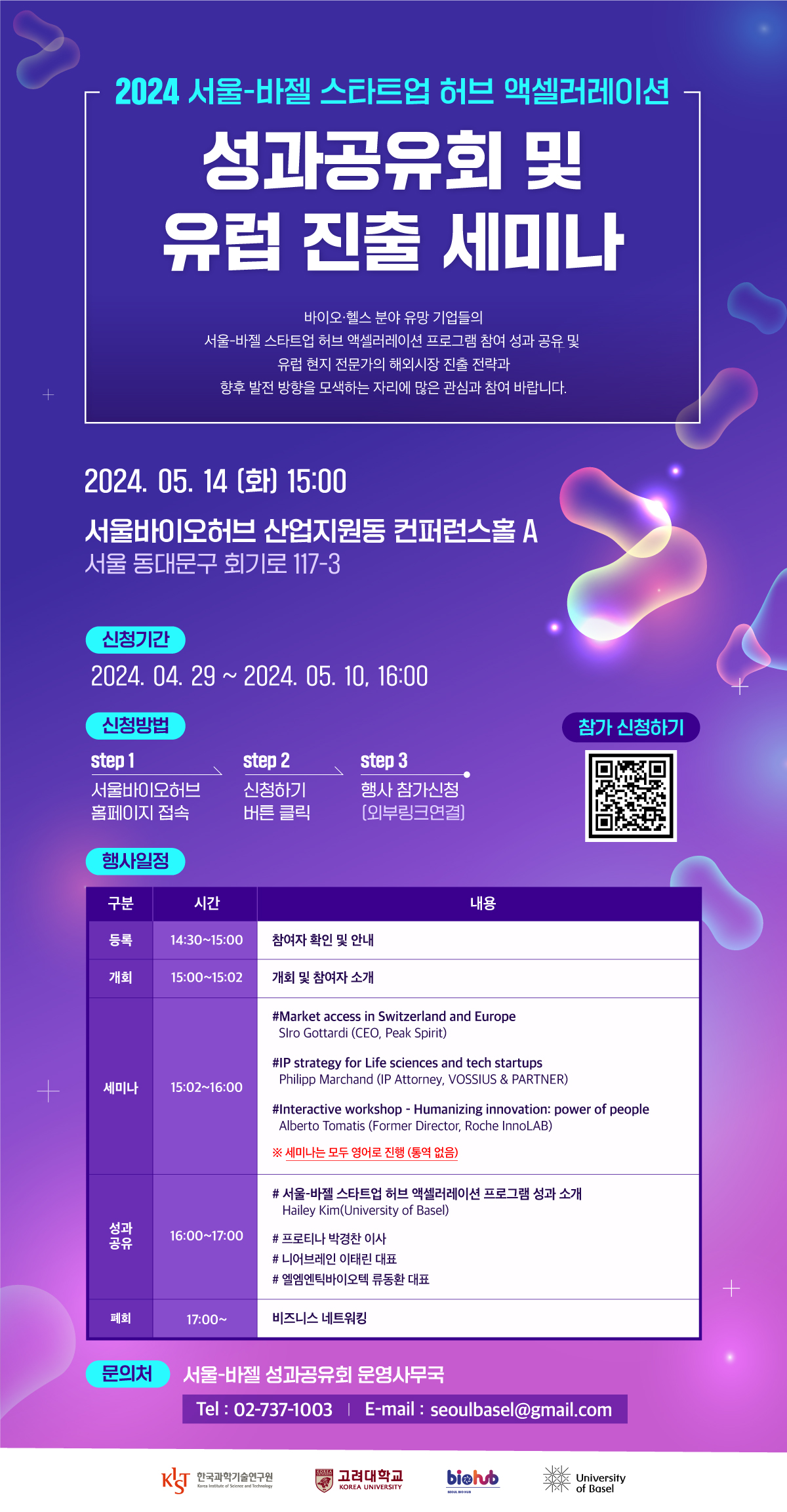 성과공유 | 16:00-17:00 | #서울-바젤 스타트업 허브 액셀러레이션 프로그램 및 성과 소개 Hailey Kim (University of Basel) # 프로티나 박경찬 이사 # 니어브레인 이태린 대표 #엘엠엔틱바이오텍 류동환 대표 |