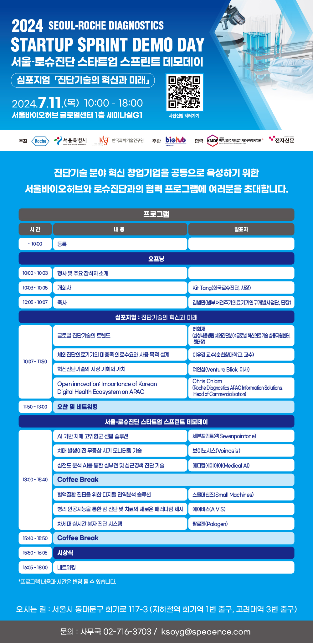 서울바이오허브에서 한국로슈진단, 로슈진단 APAC과 함께 국내 유망 바이오 기업의 글로벌 시장 진출 경쟁력 강화를 위해 「2024 서울-로슈진단 스타트업 스프린트 데모데이 및 진단기술의 혁신과 미래 심포지엄」을 운영합니다. 기업 및 관계자님들의 많은 신청 바랍니다.