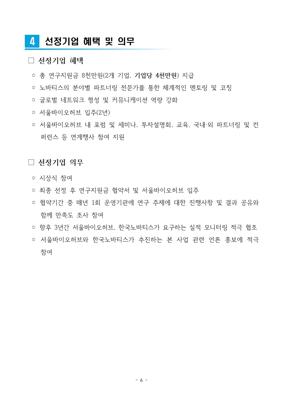 ◦ 글로벌 제약기업 노바티스社와의 협력을 통한 유망 창업기업의 발굴 및 해외 진출 역량 강화 지원