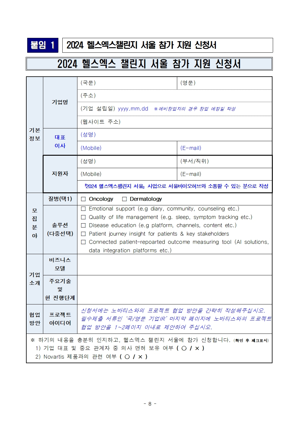 ① 신청폼 페이지에서 신청서 작성 *붙임1은 참고용이고, 해당 페이지에서 제출하셔야 합니다.