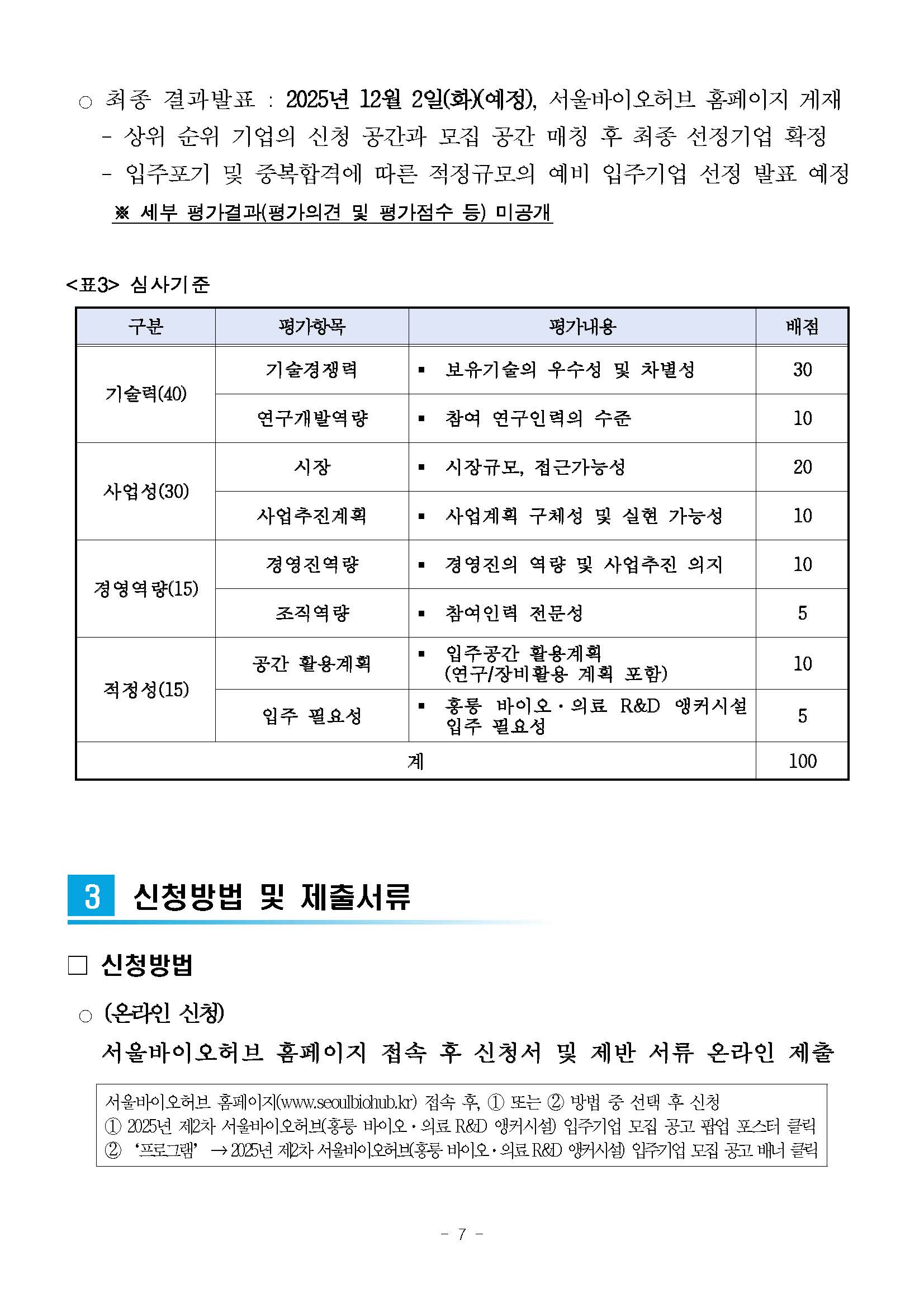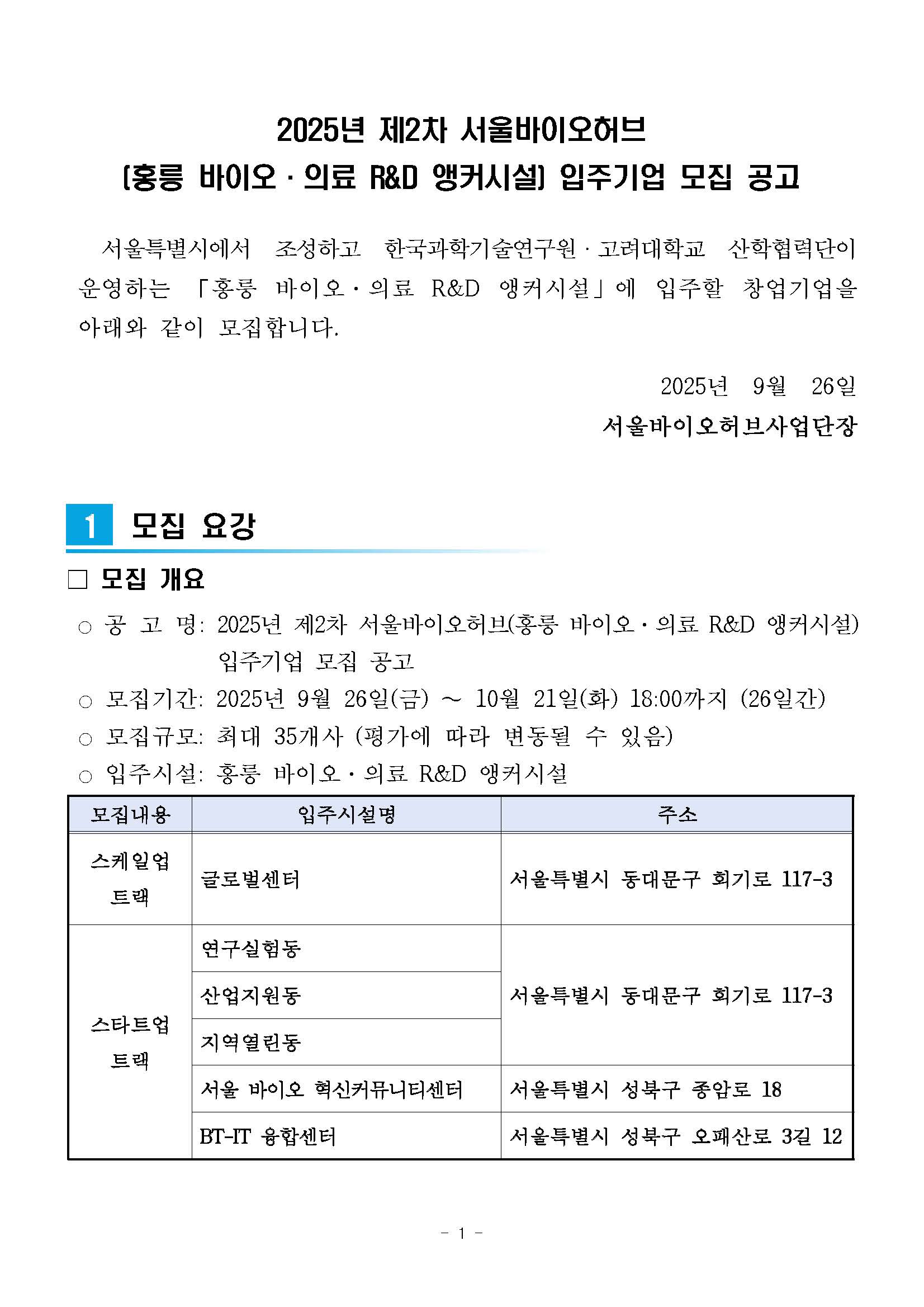 기타 2025년 제2차 서울바이오허브(홍릉 바이오·의료 R&D 앵커시설) 입주기업 모집 공고