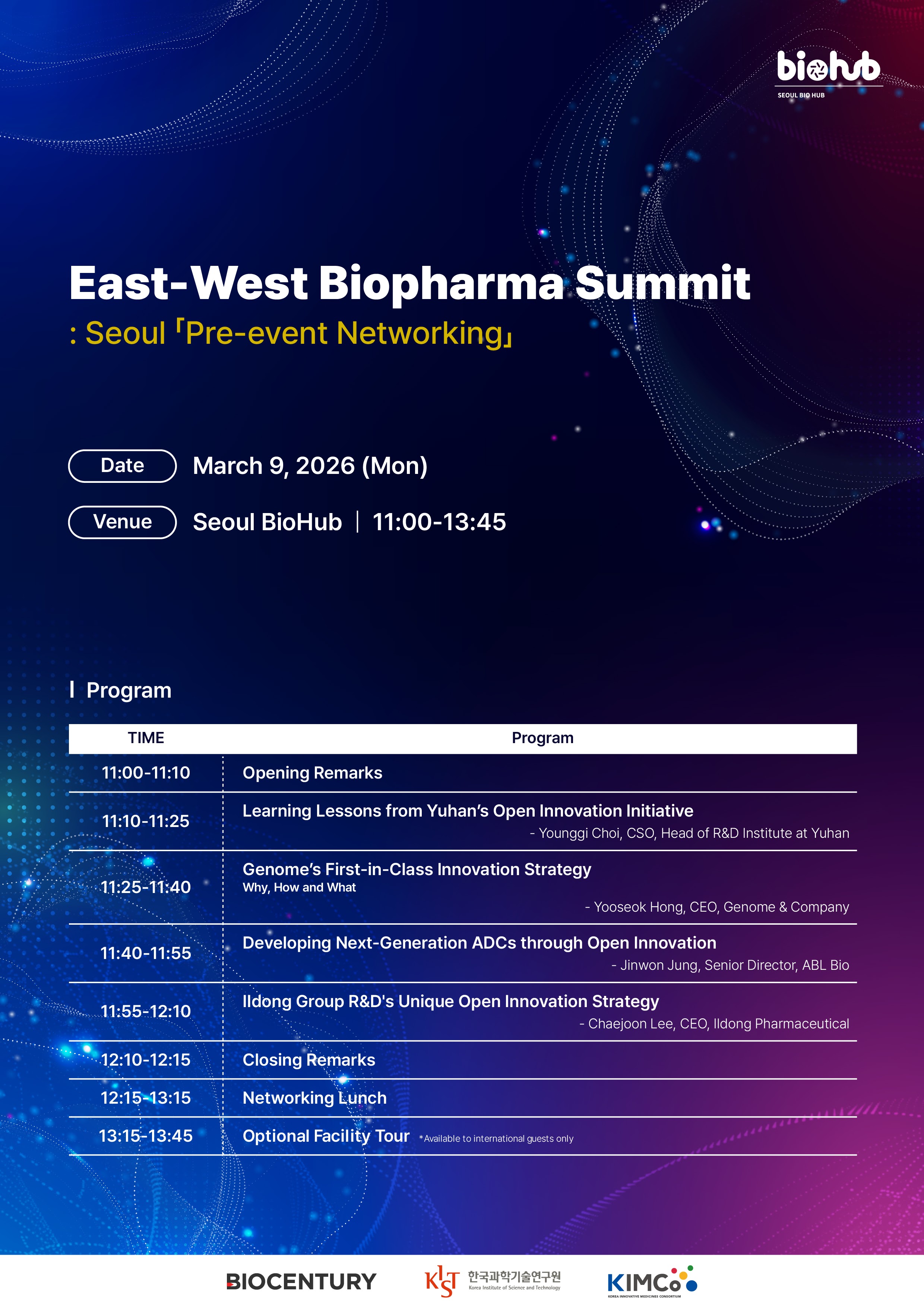 K-Venture Partnering Conference 2026 안내주최: iPark Institute Co., Ltd.본 행사는 한국 벤처기업과 일본 생명과학 기업 간 공동 연구개발을 촉진하기 위해 마련되었습니다. 참가자들은 쇼난 아이파크 생태계 내에서 직접 대면 교류를 통해 공동 혁신 기회를 발굴할 수 있으며, 아래와 같은 프로그램으로 진행됩니다.■ 행사 개요 일시: 2026년 2월 25일(수) 13:00 ~ 16:30 (일본 표준시) 장소: 쇼난 아이파크 강당 (접속 안내: https://www.shonan-ipark.com/en/about/access/) 주요 활동: 1:1 파트너링, 전시 부스, 컨설팅 테이블(규제, JETRO/가나가와 등) 참가비: ...